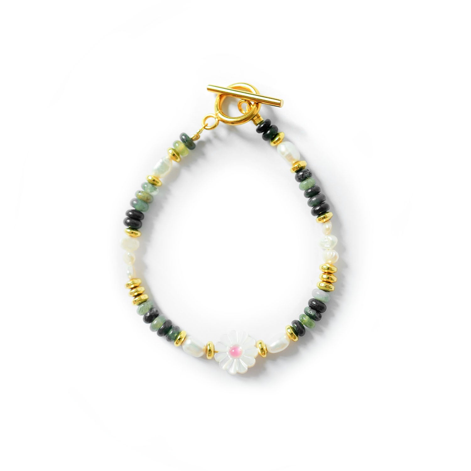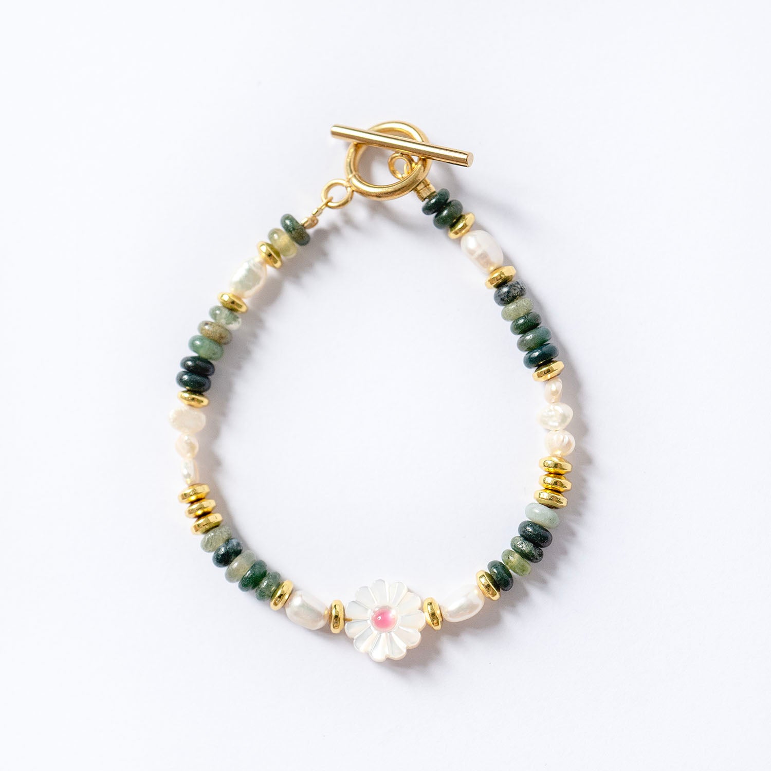 Embrace the beauty of nature with this handmade bracelet featuring the ethereal glow of Mother of Pearl and the tranquil hues of Moss Agate. At its heart lies a charming white daisy charm, symbolizing purity and new beginnings, adding a whimsical touch to this elegant piece.