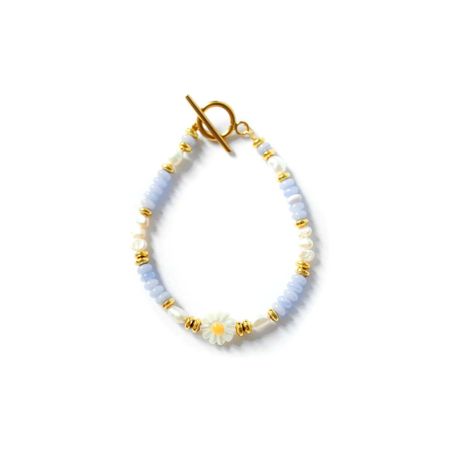 Embrace the beauty of nature with this handmade bracelet featuring the ethereal glow of Mother of Pearl and the tranquil hues of Blue Lace Agate. At its heart lies a charming white daisy charm, symbolizing purity and new beginnings, adding a whimsical touch to this elegant piece.