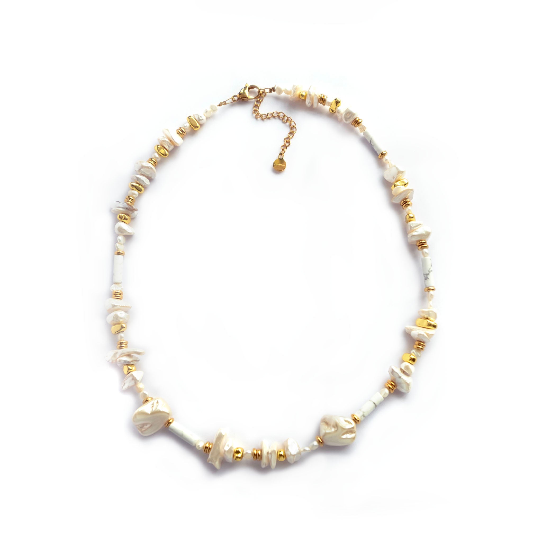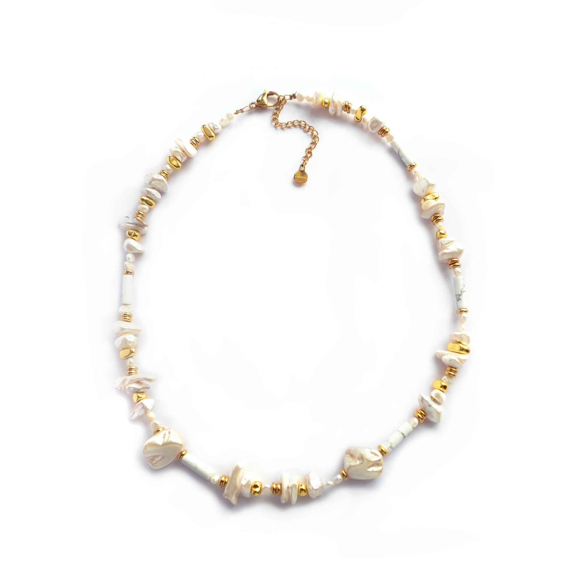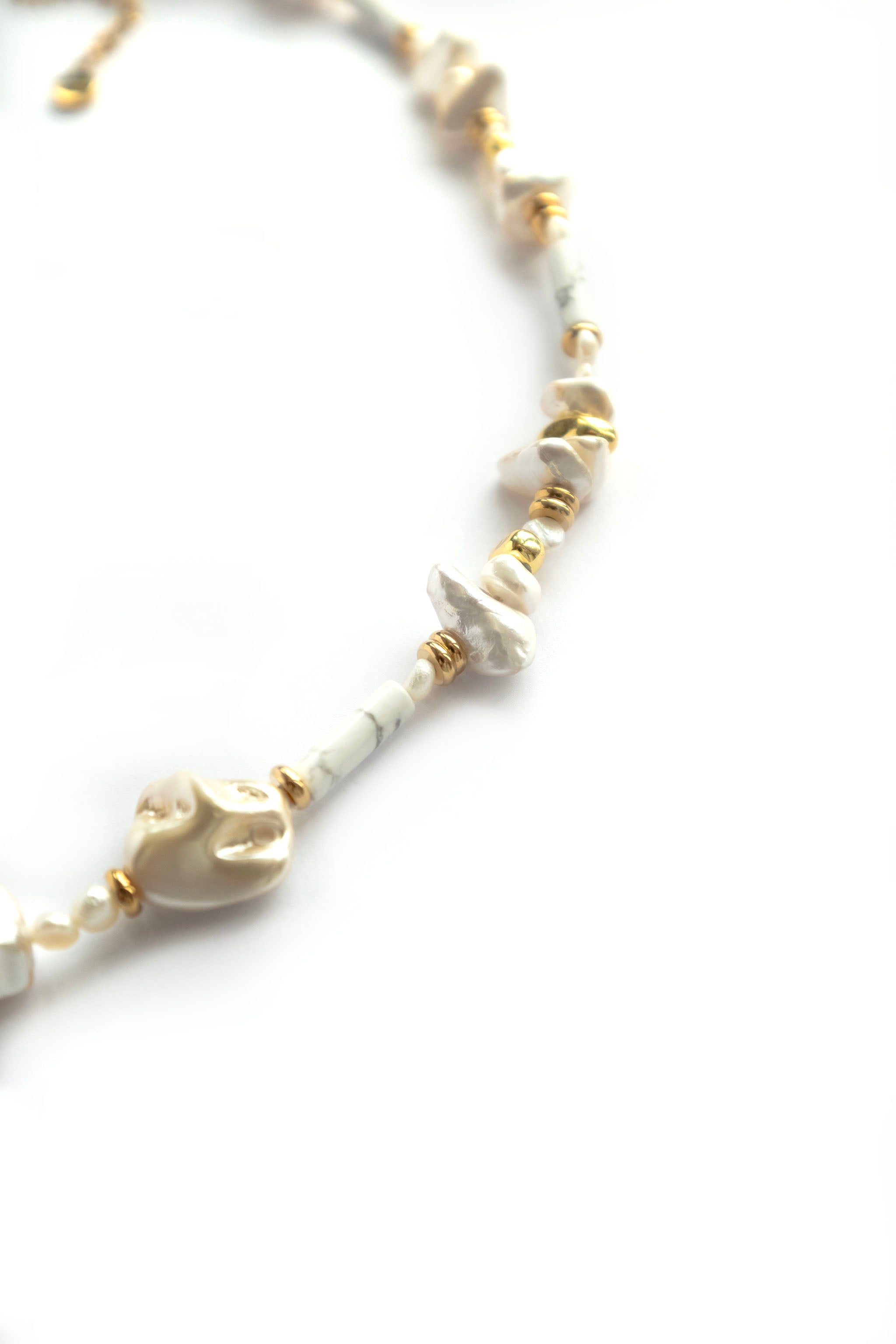 A timeless blend of classic and contemporary — the Baroque Pearls Necklace features handpicked baroque freshwater pearls and Howlite each one naturally unique in shape and luster. Thoughtfully handcrafted with durable stainless steel and gold-plated components, this piece is made to last.