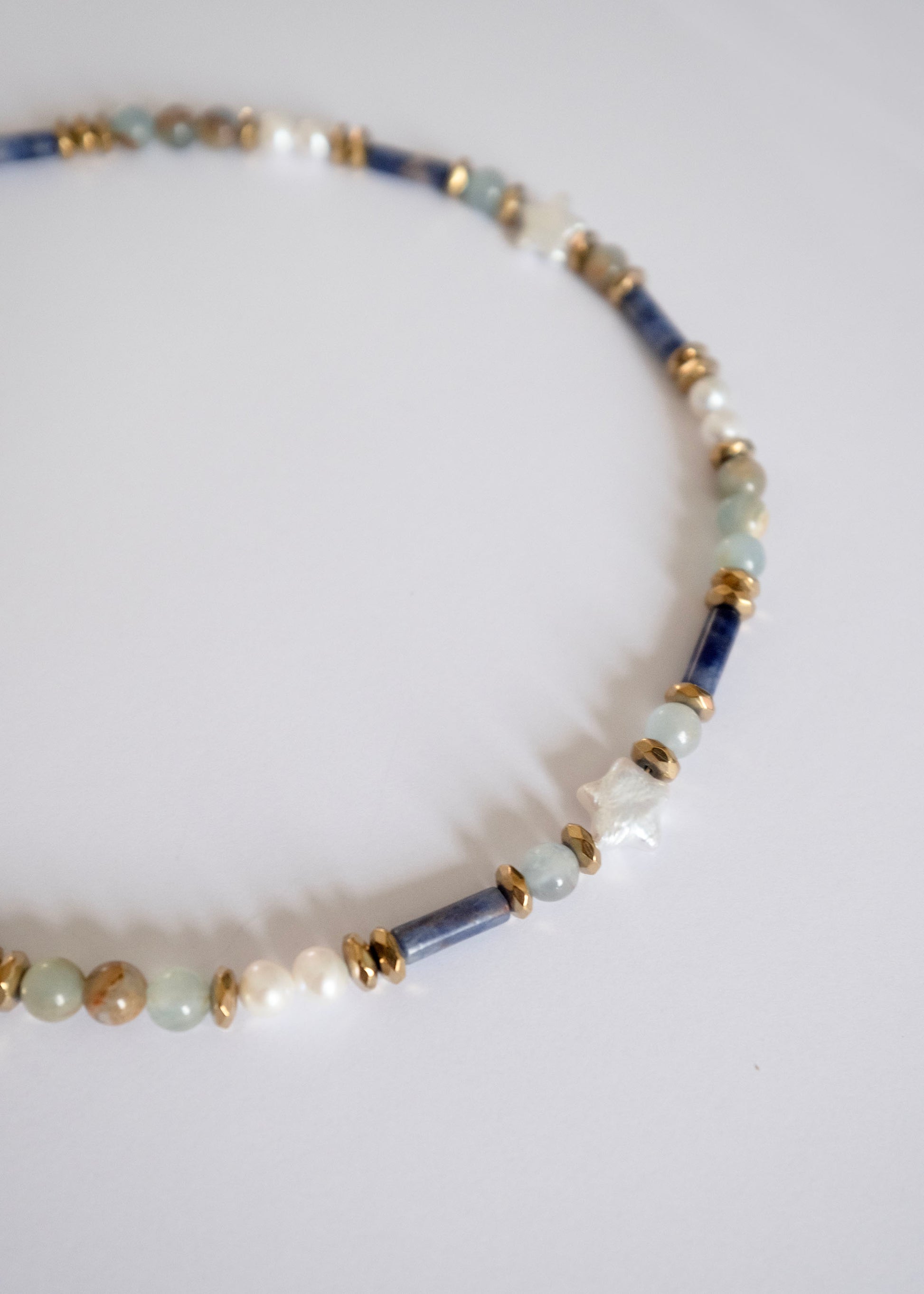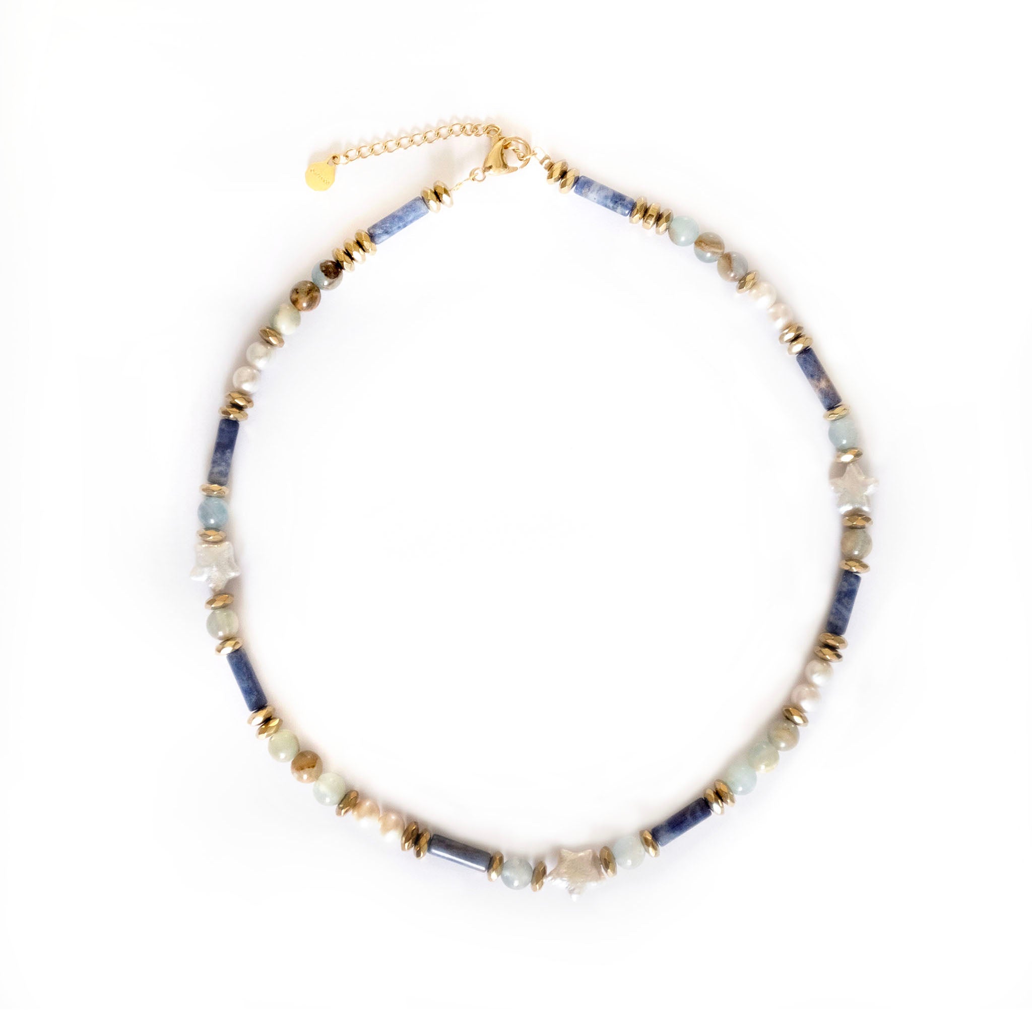 A playful yet elegant statement — the Midnight Star Beaded Necklace features deep midnight blue shade accented with delicate baroque star pearls that shimmer with subtle iridescence. Handcrafted with care, this piece captures the charm of a starlit night sky in a modern, wearable form.