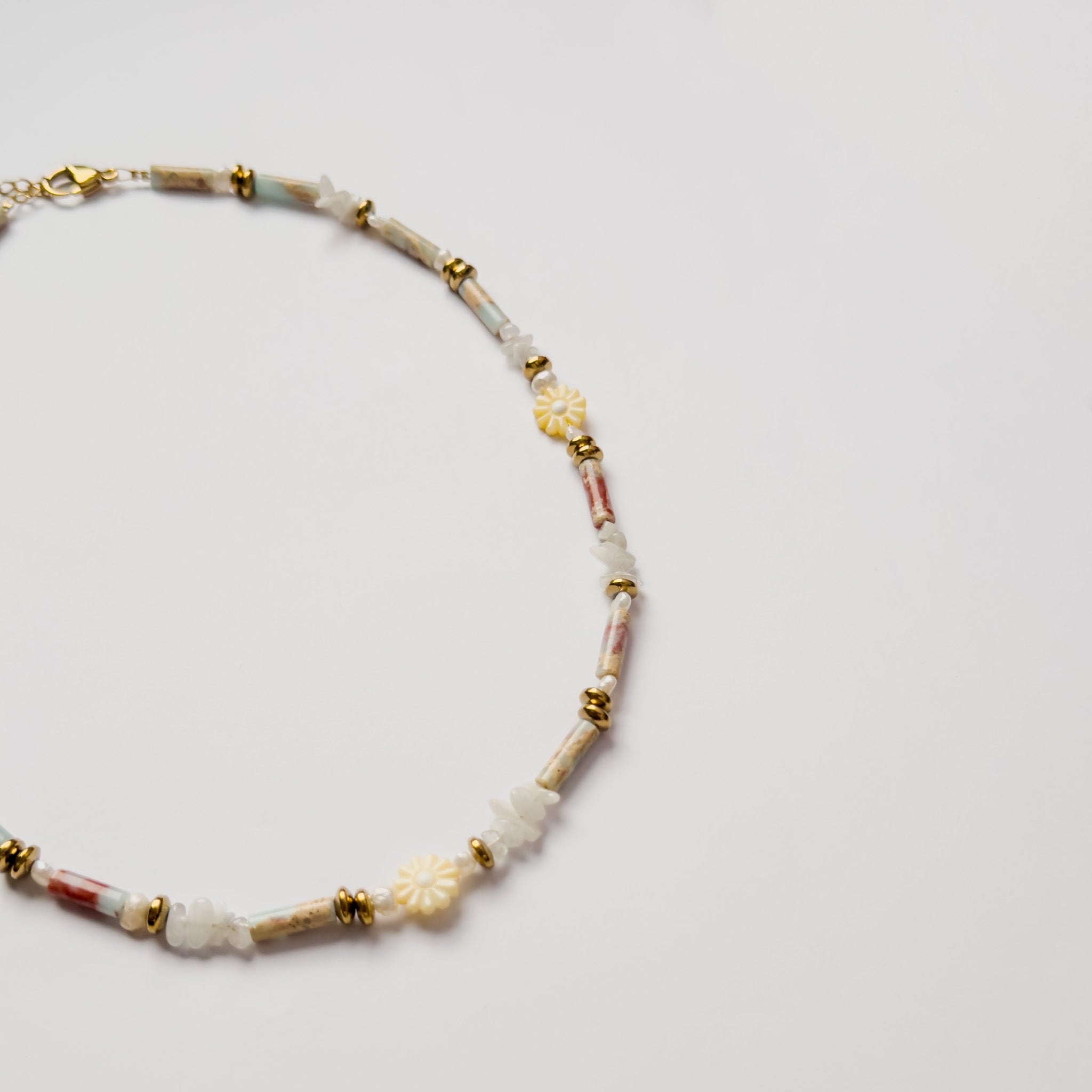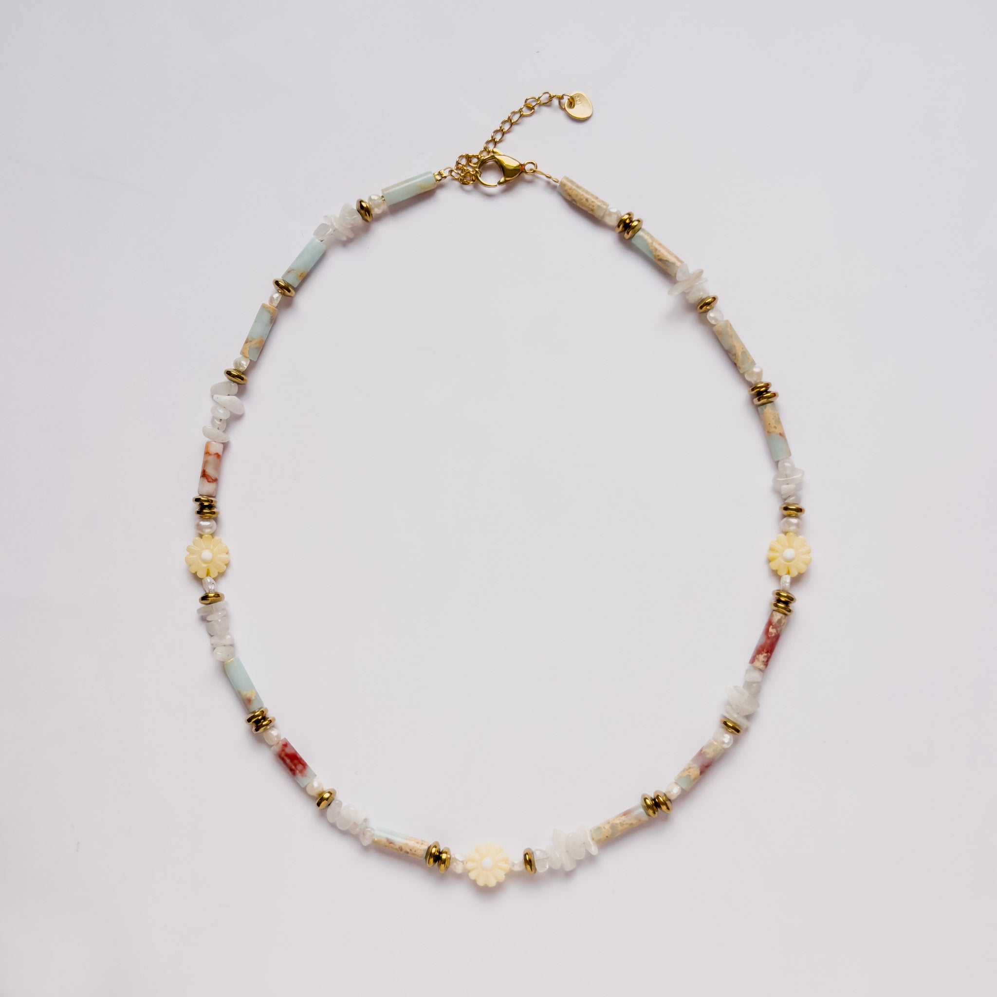 Each necklace is meticulously crafted, ensuring every piece is unique and exquisitely detailed. The focal point of this necklace is the daisy beads, each intricately carved and polished to showcase their natural patterns and hues. These beads evoke a sense of seaside charm and add a touch of whimsy to any outfit.